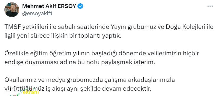 Küçükçekmece Cumhuriyet Başsavcılığı, Can Holding’e yönelik “suç örgütü kurmak”, “kaçakçılık”, “dolandırıcılık”, “kara para aklama” suçlarından başlatılan soruşturma kapsamında, sulh ceza hakimliğine başvurarak holdinge ait bazı şirketlere kayyum atanmasını istedi. Talebi değerlendiren Küçükçekmece 4. Sulh Ceza Hakimliği, Habertürk ve Show TV’nin de aralarında bulunduğu 121 şirkete TMSF’nin kayyum olarak atanmasına karar verdi. Bu gelişme sonrası Habertürk TV’nin Genel Yayın Yönetmeni Mehmet Akif Ersoy sosyal medya hesabından bir açıklama yaptı. Mehmet Akif Ersoy’un açıklaması şöyle:TMSF yetkilileri ile sabah saatlerinde Yayın grubumuz ve Doğa Kolejleri ile ilgili yeni sürece ilişkin bir toplantı yaptık. Özellikle eğitim öğretim yılının başladığı dönemde velilerimizin hiçbir endişe duymaması adına bu notu paylaşmak isterim. Okullarımız ve medya grubumuzda çalışma arkadaşlarımızla yürüttüğümüz iş akışı aynı şekilde devamnbsp;edecektir.