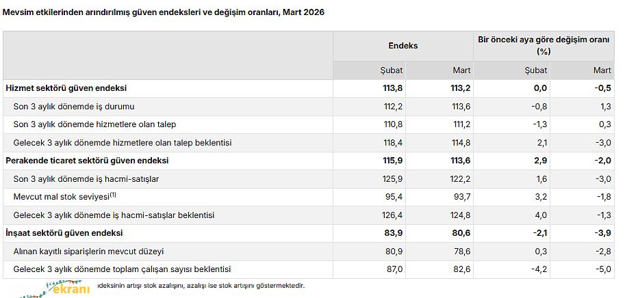 Türkiye İstatistik Kurumu (TÜİK), 2026 yılı mart ayına ait hizmet, perakende ticaret ve inşaat güven endeksleri verilerini açıkladı. Mevsim etkilerinden arındırılmış güven endeksi mart ayında bir önceki aya göre hizmet sektöründe yüzde 0,5 oranında azalarak 113,2 değerini, perakende ticaret sektöründe yüzde 2 oranında azalarak 113,6 değerini ve inşaat sektöründe yüzde 3,9 oranında azalarak 80,6 değerini aldı. Güven endeksleri 0-200 aralığında değer alıyor.