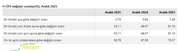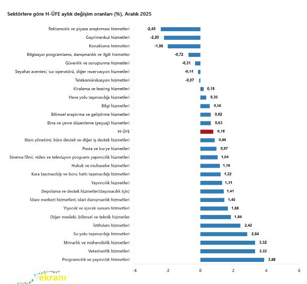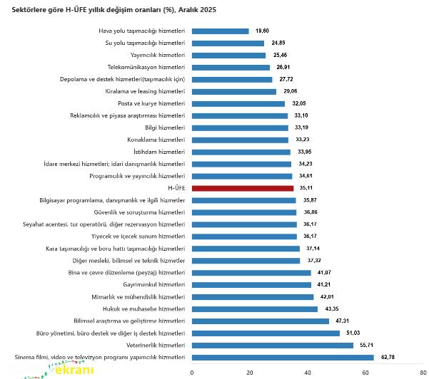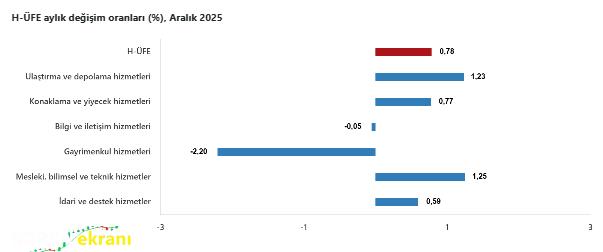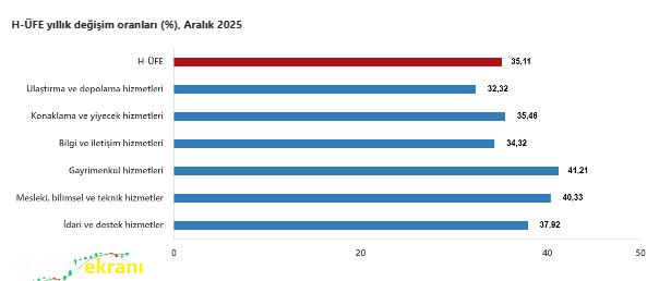 Türkiye İstatistik Kurumu (TÜİK), 2025 yılı Aralık ayına ilişkin Hizmet Üretici Fiyat Endeksi (H-ÜFE) verilerini açıkladı. Buna göre, H-ÜFE 2025 yılı Aralık ayında bir önceki aya göre yüzde 0,78, bir önceki yılın Aralık ayına göre yüzde 35,11, bir önceki yılın aynı ayına göre yüzde 35,11 ve on iki aylık ortalamalara göre yüzde 36,78 oranında artış gösterdi.