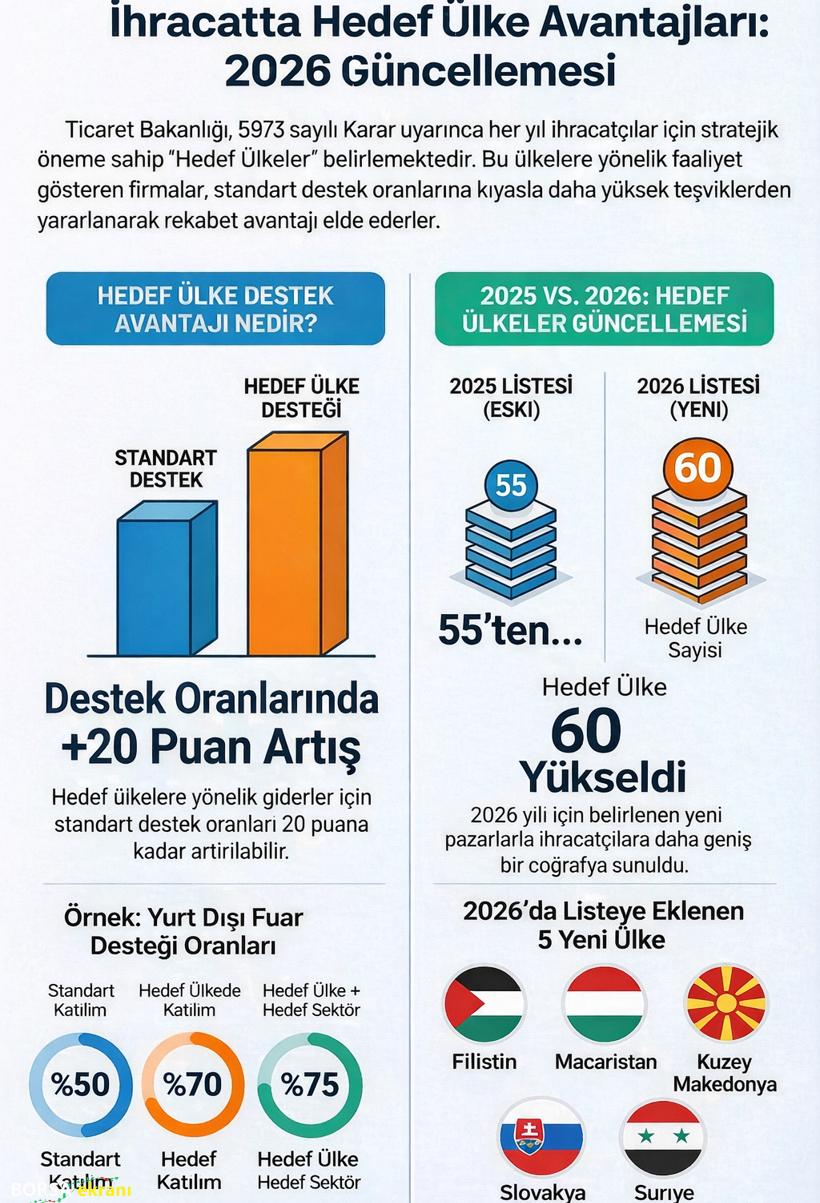 Ticaret Bakanlığı, Türk ihracatçılarının küresel pazarlardaki etkinliğini artırmak amacıyla 2026 yılında ihracatta hedef ülke sayısını 55’ten 60’a yükseltti. 2025 yılında hedef ülke olarak belirlenen Almanya, Amerika Birleşik Devletleri, Avustralya, Azerbaycan, Bahreyn, Bangladeş, Birleşik Arap Emirlikleri, Birleşik Krallık, Bosna Hersek, Brezilya, Cezayir, Çekya, Çin Halk Cumhuriyeti, Endonezya, Etiyopya, Fas, Fildişi Sahili, Filipinler, Fransa, Gana, Güney Afrika Cumhuriyeti, Güney Kore, Hindistan, Irak, İspanya, İtalya, Japonya, Kamboçya, Kanada, Katar, Kenya, Kolombiya, Kuveyt, Libya, Malezya, Meksika, Mısır, Nijerya, Özbekistan, Pakistan, Peru, Portekiz, Romanya, Rusya Federasyonu, Senegal, Sırbistan, Suudi Arabistan, Şili, Tanzanya, Tayland, Tunus, Umman, Ürdün, Venezuela ve Vietnam 2026 yılında da hedef ülke olarak yer aldı. Filistin, Suriye, Slovakya, Macaristan ve Kuzey Makedonya ise listeye yeni eklenen ülkeler oldu. Ticaret Bakanlığı’nın ihracatçıların rekabetçiliğini artırmak amacıyla her yıl 16 başlık altında devlet destekleri sağladığını belirten Ege İhracatçı Birlikleri Koordinatör Başkanı Jak Eskinazi, yurt dışı fuar katılımları, TURQUALITY, sektörel ticaret heyetleri, UR-GE, tarım, yurt içi fuar, pazara giriş, birim kira ve e-ihracat desteklerinin öne çıktığını ifade etti. Hedef ülkelere yönelik düzenlenen fuar katılımları ve sektörel ticaret heyetlerinde Ticaret Bakanlığı’nın 20 puan ilave destek sağladığını, hedef sektörlerde faaliyet gösteren firmalara ise 5 puan daha ilave destek verildiğini vurgulayan Eskinazi, Ege İhracatçı Birlikleri’nin 2025 yılının 11 aylık döneminde gerçekleştirdiği 16 milyar 860 milyon dolarlık ihracatın 12 milyar 250 milyon dolarlık bölümünün hedef ülkelere yapıldığını, bu tutarın toplam ihracatın yüzde 73’üne karşılık geldiğini söyledi.