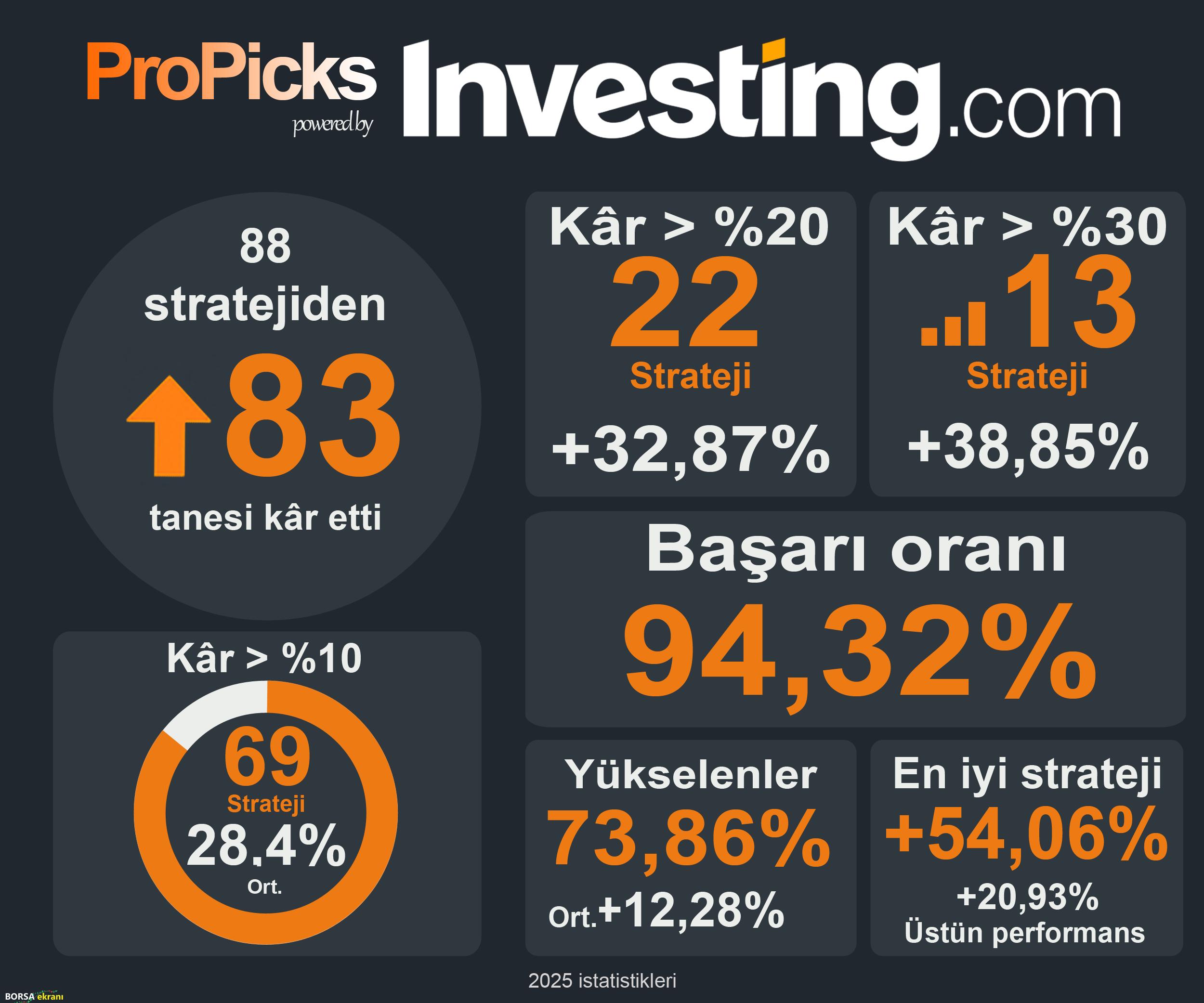 Investing.com – Kasım ayı, borsada fark yaratmak isteyen yatırımcılar için hareketli başladı. Yapay zekamız, 1 Kasım itibarıyla güçlü yükseliş potansiyeli taşıyan hisseleri belirledi ve yalnızca iki işlem gününde bile dikkat çekici sonuçlar ortaya çıktı. Aşağıda, kısa sürede çift haneli kazanç sağlayan hisselerden bazılarını bulabilirsiniz:ABD stratejileri arasında kazananlar olduğu kadar geride kalanlar da var: InvestingPro Üyesi Değil misiniz? Şimdi Buraya Tıklayın, Yapay Zekanın Gücünden Yararlanın Üstelik bu sonuçlar tesadüf değil. 2025 yılı boyunca 88 ProPicks yapay zekâ stratejisinin genel performansı da bu başarının sürekliliğini gösteriyor. Peki, aylara göre sonuçlar nasıl şekillendi?