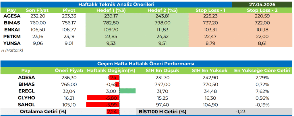 İnfo Yatırım, haftalık teknik analiz raporunda AGESA Hayat ve Emeklilik A.Ş. (AGESA), BİM Birleşik Mağazalar A.Ş. (BIMAS), Enka İnşaat ve Sanayi A.Ş. (ENKAI), Petkim Petrokimya Holding A.Ş. (PETKM) ve Yünsa Yünlü Sanayi ve Ticaret A.Ş. (YUNSA) paylarını öne çıkardı. Raporda hisseler için pivot seviyeler, hedef fiyatlar ve stop-loss noktaları paylaşıldı.