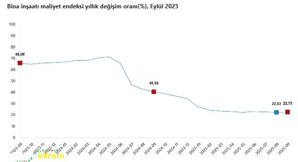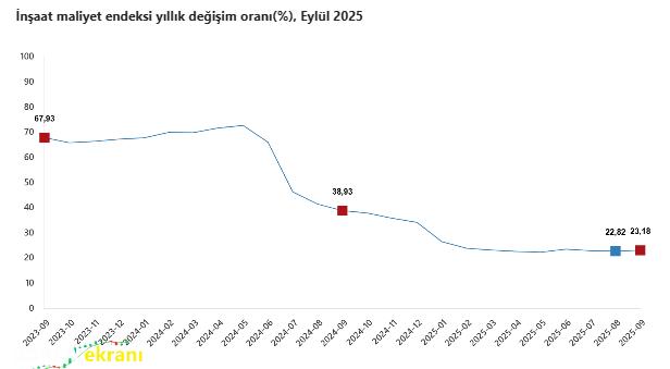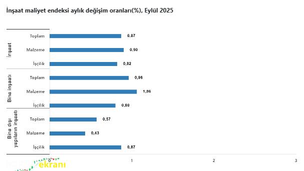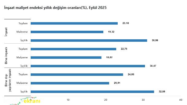 TÜİK, 2025 yılı Eylül ayına ait inşaat maliyet endeksini açıkladı. Buna göre inşaat maliyet endeksi, eylülde bir önceki aya göre yüzde 0,87, bir önceki yılın aynı ayına göre ise yüzde 23,18 oranında arttı.nbsp;Bir önceki aya göre malzeme endeksi yüzde 0,90, işçilik endeksi yüzde 0,82 arttı. Ayrıca bir önceki yılın aynı ayına göre malzeme endeksi yüzde 19,32, işçilik endeksi de yüzde 30,99 artış gösterdi.