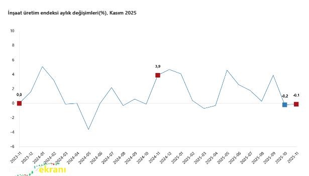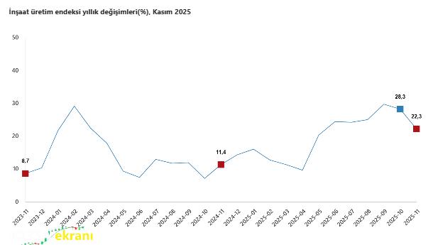 Türkiye İstatistik Kurumu, (TÜİK) 2025 yılı Kasım ayına ait inşaat üretim endeksi verilerini açıkladı. Buna göre, inşaatın alt sektörleri (2021=100 referans yıllı) incelendiğinde, 2025 yılı Kasım ayında bina inşaatı sektörü endeksi bir önceki yılın aynı ayına göre yüzde 23,4, bina dışı yapıların inşaatı sektörü endeksi yüzde 16,7 ve özel inşaat faaliyetleri sektörü endeksi ise yüzde 22,5 arttı.