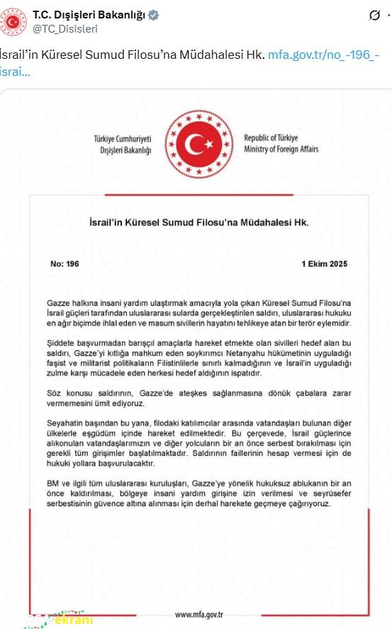 “İnsani yardım ulaştırmak amacıyla Gazze’ye doğru yol alan Küresel Sumud Filosu’na yönelik İsrail donanması unsurları tarafından uluslararası sularda gerçekleştirilen saldırı neticesinde alıkonulan (24) Vatandaşımız ile ilgili olarak Birleşmiş Milletler Deniz Hukuku Sözleşmesindeki düzenlemeler, 5271 sy. Ceza Muhakemesi Kanunu’nun 15. maddesindeki yetki kuralları ve 5237 sy. Türk Ceza Kanunu’nun 12/13. Maddelerindeki görev kuralları çerçevesinde Cumhuriyet Başsavcılığımızca ‘Kişiyi Hürriyetinden Yoksun Kılma’ ‘Ulaşım araçlarının kaçırılması veya alıkonulması’, ‘Nitelikli Yağma’, ‘Mala Zarar Verme’ ve ‘Eziyet’ suçları kapsamında soruşturma başlatılmış olup soruşturma çok yönlü olarak sürdürülmektedir. Kamuoyunun bilgisine duyurulur”