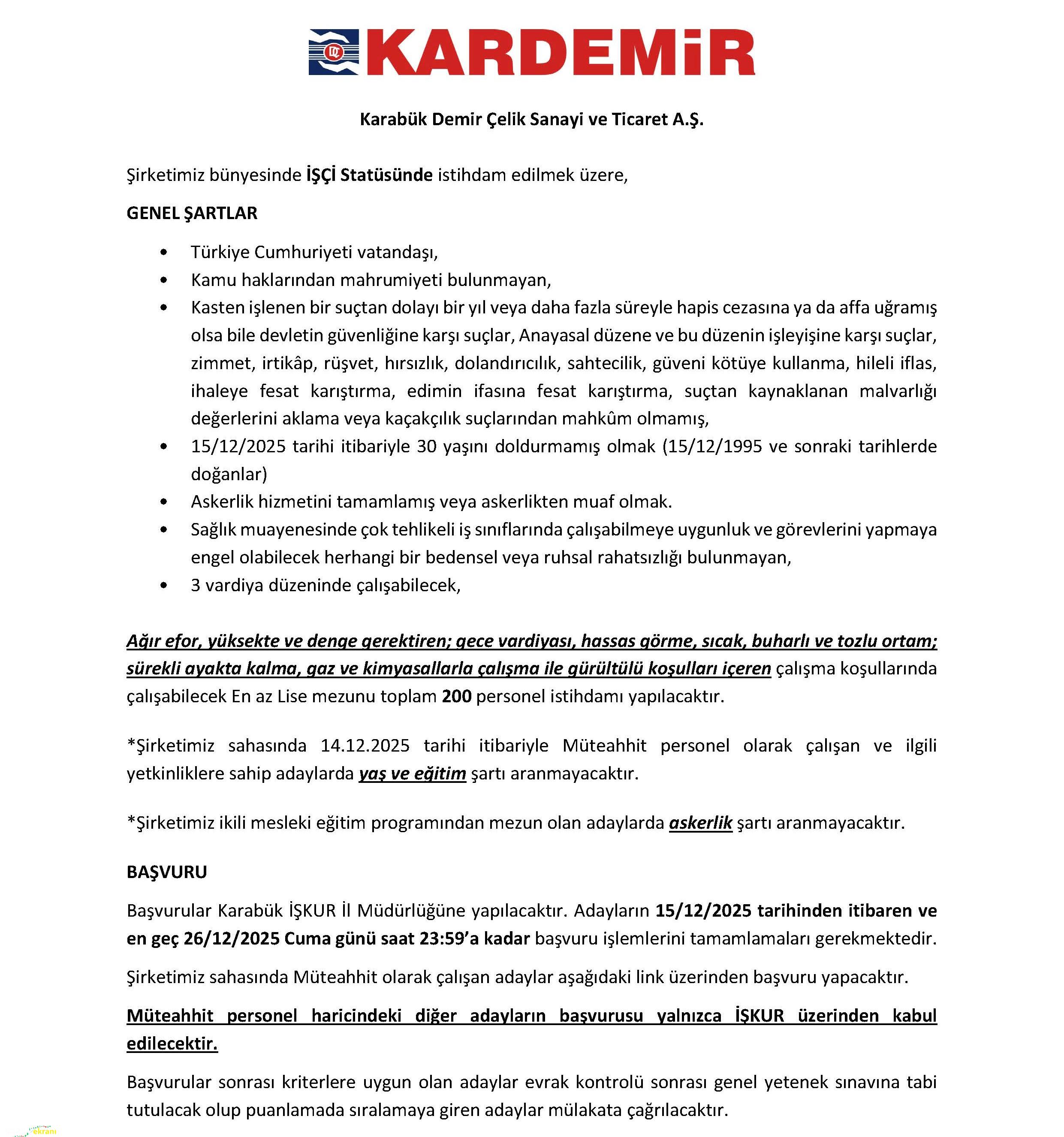 Karabük Demir ve Çelik Fabrikaları (KARDEMİR) şirket bünyesinde, işçi statüsünde en az lise mezunu 200 personelin istihdam edileceğini açıkladı.