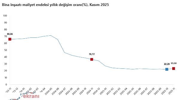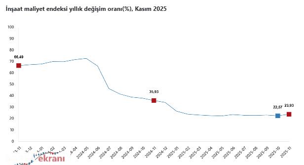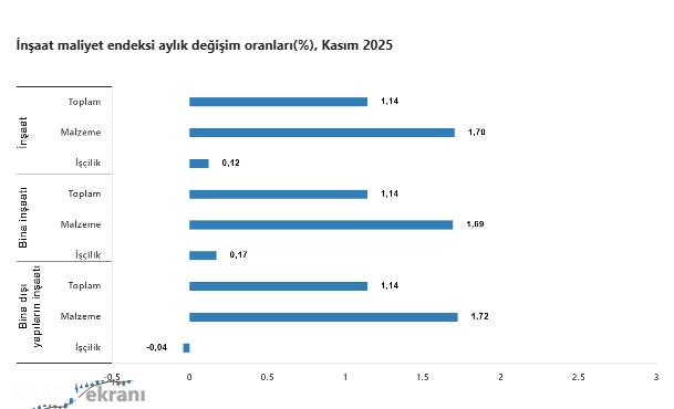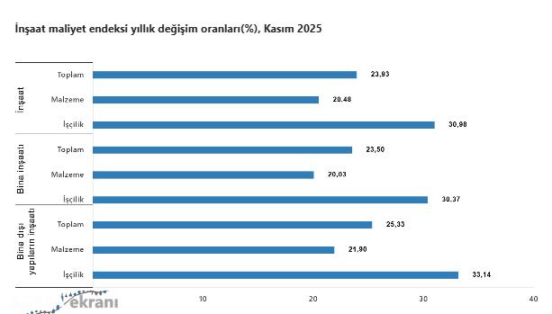 Türkiye İstatistik Kurumu (TÜİK) 2025 yılı Kasım ayına ilişkin inşaat maliyet endeksi verilerini açıkladı. Buna göre inşaat maliyet endeksi, 2025 yılı Kasım ayında bir önceki aya göre yüzde 1,14 arttı, bir önceki yılın aynı ayına göre ise yüzde 23,93 arttı.nbsp;Bir önceki aya göre malzeme endeksi ise yüzde 1,70, işçilik endeksi yüzde 0,12 oranında artış gösterdi. Ayrıca bir önceki yılın aynı ayına göre malzeme endeksi yüzde 20,48, işçilik endeksi yüzde 30,98 arttı.