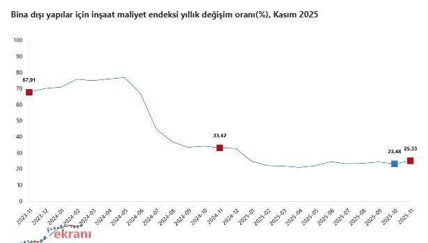 Bina dışı yapılar için inşaat maliyet endeksi, bir önceki aya göre yüzde 1,14, bir önceki yılın aynı ayına göre yüzde 25,33 arttı.