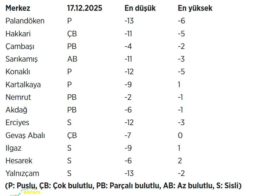 Meteoroloji Genel Müdürlüğü verilerinden derlenen bilgilere göre, kayak merkezlerindeki kar kalınlığı Palandöken’de 55, Hakkari’de 49, Çambaşı’nda 35, Sarıkamış’ta 33, Süleymaniye’de 29, Konaklı’da 25, Kartalkaya ve Nemrut’ta 23, Akdağ’da 19, Erciyes’te 17, Gevaş Abalı’da 11, Mersivan’da 10, Ilgaz ve Hesarek’te 9, Yıldıztepe’de 8 ve Yalnızçam’da 6 santimetre ölçüldü.