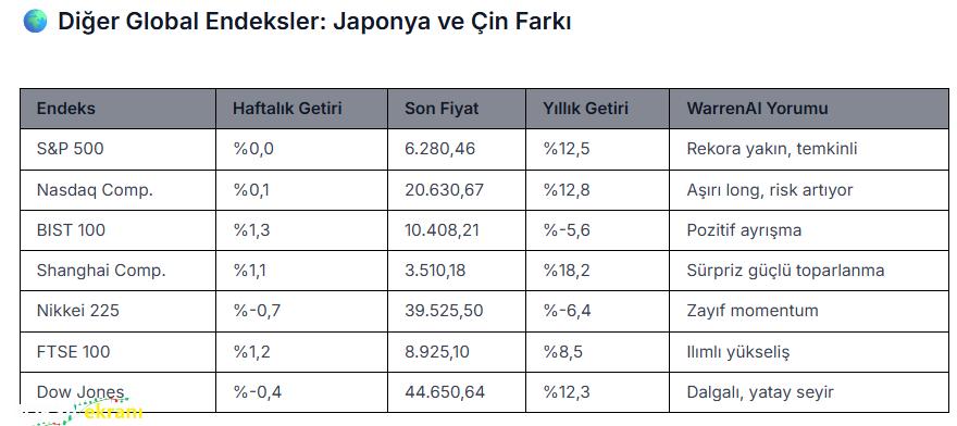 Investing.com – Borsa İstanbul haftayı %1,3 yükselişle kapatırken, S&P 500 ve Nasdaq rekor seviyelerden hafif bir soluk aldı. Küresel riskler, ticaret savaşları ve beklenti yönetimi piyasaları şekillendirdi. Türkiye yerel piyasaları, hem dış ticaret haberleri hem de içerideki faiz indirimi beklentileriyle pozitif ayrıştı; globalde ise ABD endekslerinde kar realizasyonu ve temkinli yükseliş görüldü.