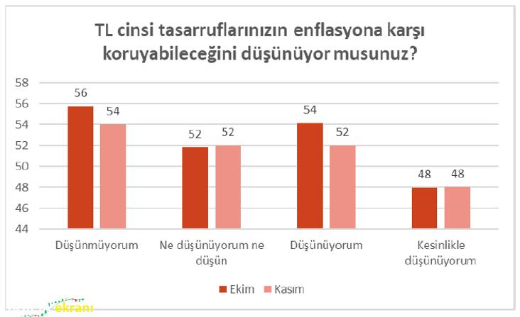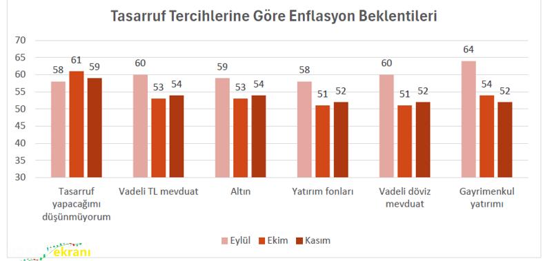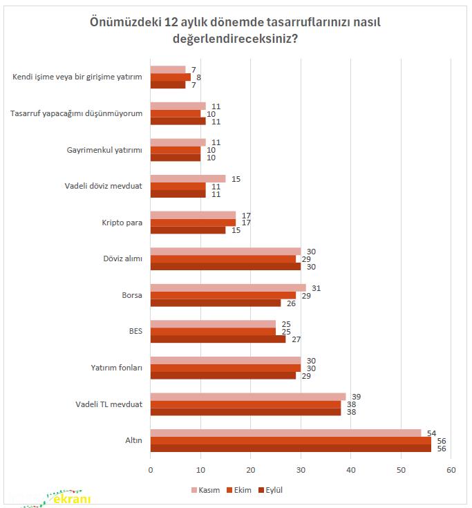 Ankette ekim ayında da, geçtiğimiz aylarda olduğu gibi anket katılımcılarına önümüzdeki 12 ay içinde tasarruflarını hangi araçlarda değerlendirmeyi planladıkları soruldu. Bir önceki aya kıyasla döviz mevduat, döviz alımı, borsa ve vadeli TL mevduat tercihelerinde artış gözlenirken altın tercihinde hafif bir düşüş gözlendi.