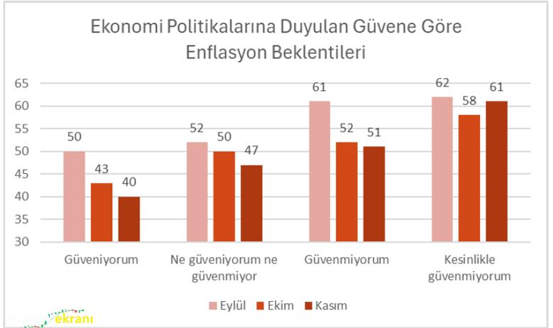 Önceki aylara kıyasla, bu dönemde “güveniyorum” diyen katılımcılar ile “kesinlikle güvenmiyorum” ifadesini kullananlar arasındaki enflasyon beklentisi farkının 21 puana kadar genişlediği dikkati çekti.