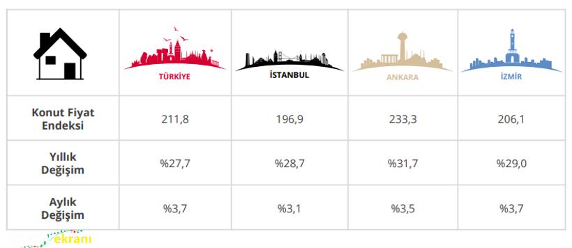 Endeks, yıllık bazda nominal olarak yüzde 27,7 artış kaydederken, aynı dönemde reel olarak yüzde 2,3 oranında azaldı. Böylece konut fiyatlarında enflasyona göre sınırlı gerileme yaşadı.