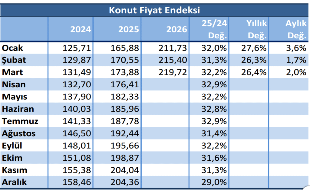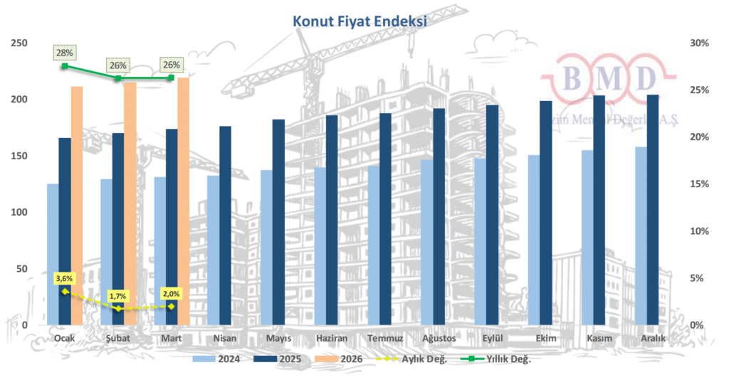 Türkiye Cumhuriyet Merkez Bankası verilerine göre Konut Fiyat Endeksi, mart ayında aylık %2 artarken yıllık bazda %26,4 yükseldi. Metrekare başına ortalama konut fiyatı 48 bin 323 TL’ye çıkarken, reel endeks ise yıllık %3,4 geriledi.