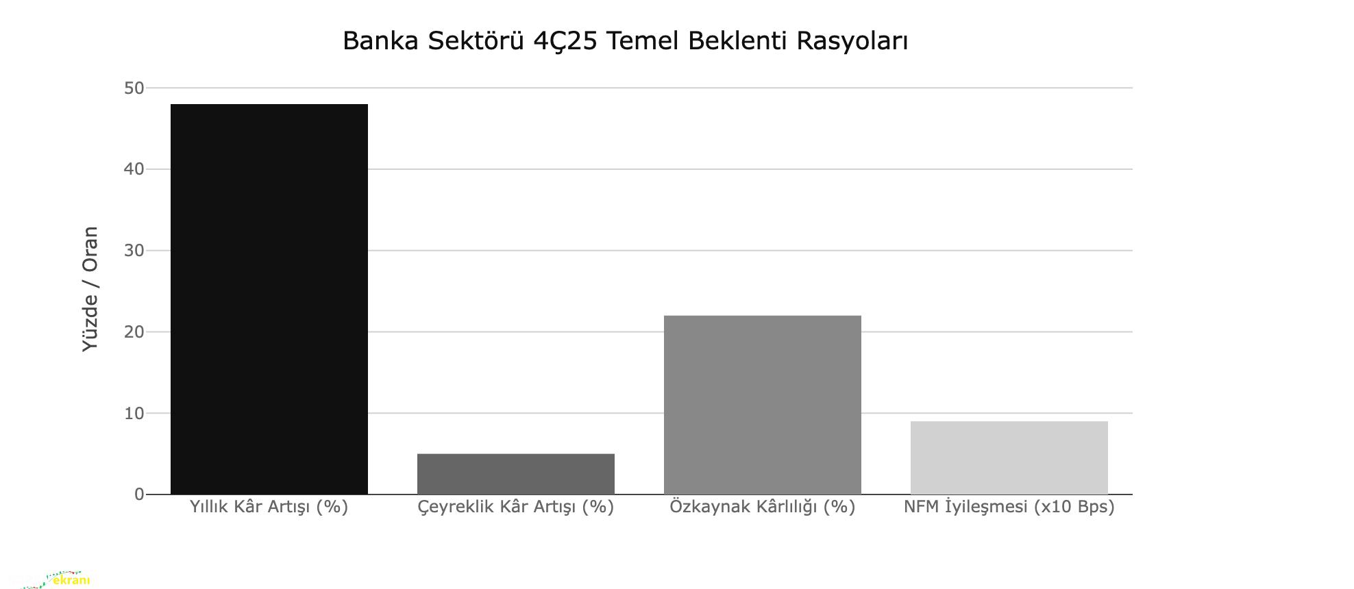 Analizler, bankacılık sektörü net kârının 2025’in son çeyreğinde yıllık bazda %48 artmasını bekliyor. Çeyreklik bazda ortalama %5 net kâr büyümesi ve %22 özkaynak kârlılığı öngörülürken; Akbank, İş Bankası ve VakıfBank’ın bu alanda öne çıkması bekleniyor.