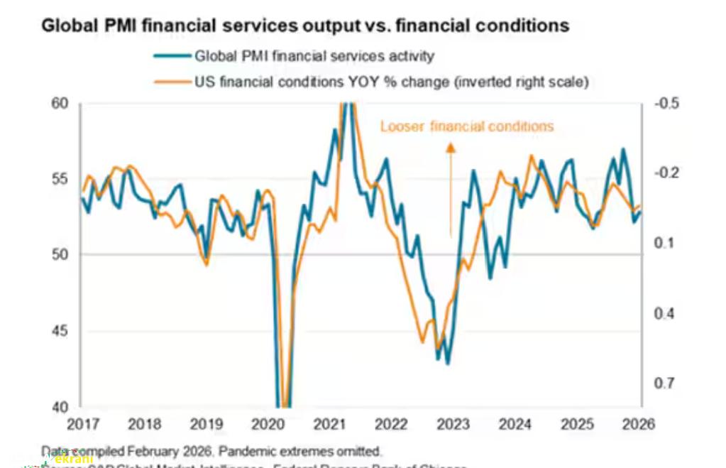 Hizmet sektöründeki yavaşlamanın merkezinde finansal hizmetler yer alıyor. Küresel finansal hizmetler PMI çıktı endeksi, aralık–ocak döneminde ortalama 52,5 seviyesinde kaldı. Bu oran, önceki altı ayda görülen 55,2 ortalamasının belirgin şekilde altında. Yeni sipariş verileri de benzer bir tablo çiziyor. Kasım öncesi döneme kıyasla: Analistler, bu yavaşlamanın kısmen küresel finansal koşullardaki gevşemenin son iki ayda daha sınırlı hale gelmesiyle bağlantılı olduğunu belirtiyor. Bu eğilim, örneğin Chicago Fed Finansal Koşullar Endeksi gibi göstergelerde de izlenebiliyor.