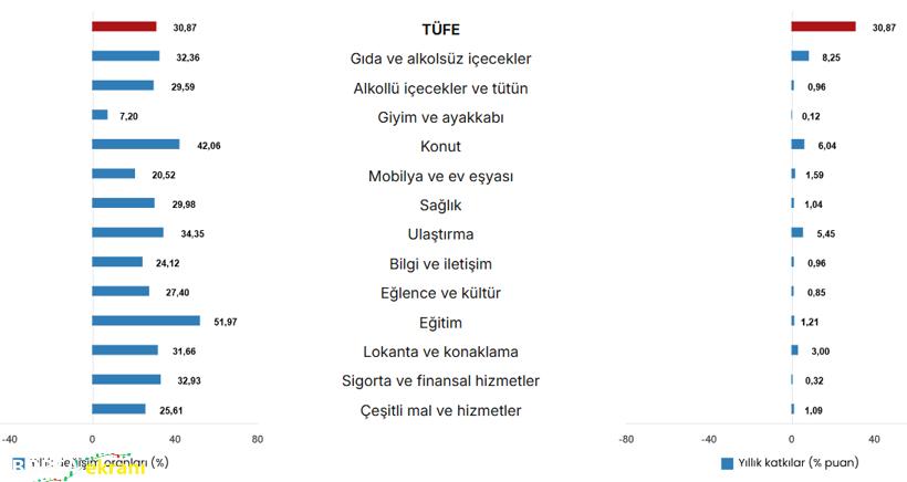 Bu üç ana grubun yıllık enflasyona katkısı ise gıdada 8,25 puan, ulaştırmada 5,45 puan ve konutta 6,04 puan oldu.