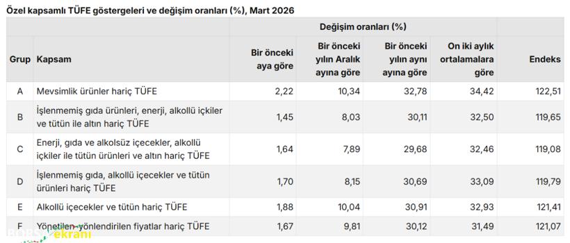 İşlenmemiş gıda, enerji, alkollü içkiler ve tütün ile altın hariç tutularak hesaplanan özel kapsamlı TÜFE göstergesi (B) mart ayında aylık yüzde 1,45, yıllık ise yüzde 30,11 arttı.