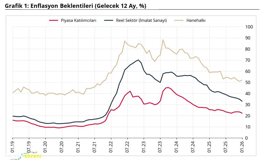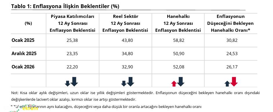 Türkiye Cumhuriyet Merkez Bankası (TCMB) ile TÜİK’in ortak çalışmasıyla oluşturulan 2026 Ocak Sektörel Enflasyon Beklentileri raporu yayımlandı. Açıklanan verilere göre, 2026 yılı Ocak ayında 12 ay sonrası yıllık enflasyon beklentileri bir önceki aya kıyasla, piyasa katılımcıları için 1,15 puan azalarak yüzde 22,20 seviyesine, reel sektör için ise 1,90 puan azalarak yüzde 32,90 seviyesine geriledi. Hanehalkı için ise 1,18 puan artarak yüzde 52,08 seviyesine yükseldi. Piyasa Katılımcıları Anketi, İktisadi Yönelim Anketi ve Türkiye İstatistik Kurumu iş birliğiyle yürütülen Tüketici Eğilim Anketi ile finansal ve reel sektör uzmanlarının, imalat sanayi firmalarının ve hanehalkının 12 ay sonrası yıllık tüketici enflasyonu beklentileri derlenerek Sektörel Enflasyon Beklentileri elde edildi.