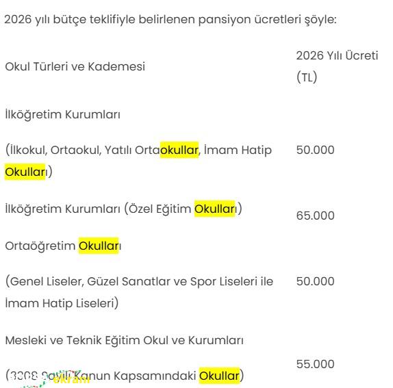 AA muhabirinin 2026 yılı Merkezi Yönetim Bütçe Kanunu Teklifi’nden yaptığı derlemeye göre, pansiyon ücretleri ilköğretim kurumları ve ortaöğretim okullarında gelecek yıl 50 bin liraya yükselecek.