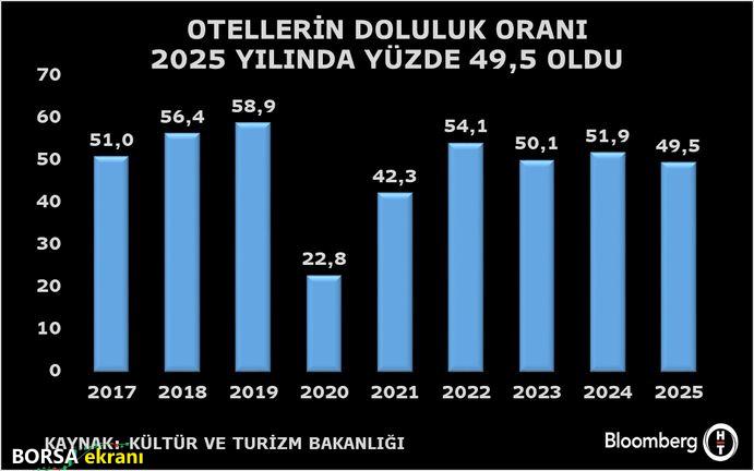 İşletme ve basit belgeli konaklama tesislerinde geceleme sayısı artmasına rağmen, 2025 yılında yıllık bazda doluluk oranları gerilemeyi sürdürdü. Kültür ve Turizm Bakanlığı verilerine göre 2024 yılında yıllık bazda yüzde 51,91 olan otellerdeki doluluk oranı 2025 yılında yüzde 49,54’e geriledi. Doluluk oranlarının yüzde 30,40’ını yabancı ziyaretici, yüzde 19,15’ini de yerli ziyaretçiler gerçekleştirdi. Veriler, 2025 yılındaki doluluk oranının 2024’teki yüzde 51,9 ve 2023’teki yüzde 50,1 seviyelerinin altında kaldığını ortaya koydu. Böylece otel doluluklarında pandemi sonrası dönemde gözlenen toparlanmanın yerini son yıllarda kademeli bir düşüş eğilimine bıraktığı görüldü. 2017-2025 dönemini kapsayan verilere göre, Türkiye’de otel doluluk oranlarında en yüksek seviye pandemi öncesi son yıl olan 2019’da yüzde 58,9 ile kaydedilmişti. Küresel salgının etkisiyle 2020 yılında doluluk oranı sert düşüşle yüzde 22,8’e gerilerken, sektör 2022 yılında yüzde 54,1 ile güçlü bir toparlanma sergiledi. Ancak sonraki dönemde toparlanmanın ivme kaybettiği ve son üç yılda doluluk oranlarının yeniden düşüş eğilimine girdiği dikkat çekti. Veriler, turizm sektöründe talep, maliyetler ve küresel gelişmelerin doluluk oranları üzerindeki etkisinin devam ettiğine işaret ediyor. Bakanlık tarafından açıklanan verilere göre 2025 yılında geceleme ve tesis geliş sayıları artış söz konusu. Verilere göre 2025 yılında tesise geliş sayısı 252 milyon 323 bin 483 olurken, geceleme sayısı da 98 milyon 981 bin 217 olarak kaydedildi.