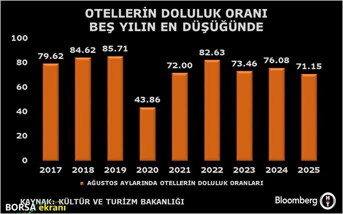İşletme ve basit belgeli konaklama tesislerinde geceleme sayısı artmasına rağmen, doluluk oranı Temmuz ayında olduğu gibi Ağustos ayında da düşüş gösterdi. Kültür ve Turizm Bakanlığı tarafından açıklanan verilere göre, geçen yıl Ağustos ayında yüzde 76,08 olan otellerde doluluk oranı, bu yıl aynı ayda yüzde 71,15 seviyesine geriledi. Doluluk oranları son 2021 yılından beri izlenen en düşük veri olarak kaydedildi. Oteller doluluklarının yüzde 42,88’ini yabancılar, yüzde 28,27’sini yerliler oluşturdu. Ağustos ayında geceleme sayısı 38 milyon 164 bin 348 olarak açıklandı. Geçen yılın aynı ayında geceleme sayısı 30 milyon 381 bin 718 seviyesindeydi. Gecelemelerin 23 milyon bin 809’u yabancı, 15 milyon 162 bin 539’u yerli ziyaretçilerden oluştu. Tesislere gelen kişi sayısı 6 milyon 926 bin 612’si yabancı, 7 milyon 198 bin 305’i yerli olmak üzere toplam 14 milyon 124 bin 917 olarak açıklandı. Ziyaretçilerin kalış süresi geçen yılın Ağustos ayında 2,84 gün olurken, bu yılın aynı ayında 2,70’e indi.