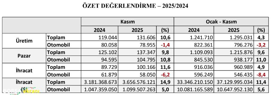 Geçen yılın aynı dönemine göre yüzde 4 artış gösteren toplam üretim 1 milyon 295 bin 31 adet olarak gerçekleşti. Geçen yılın ilk 11 aylık dönemine göre yüzde 3 azalan otomobil üretimi ise 796 bin 276 adede ulaştı. Traktör üretimiyle birlikte toplam üretim ise 1 milyon 320 bin 119 adet olarak gerçekleşti. Ticari araç grubunda, yılın ilk 11 ayında üretim yüzde 19, hafif ticari araç grubunda yüzde 21, ağır ticari araç grubunda ise yüzde 1 arttı. 2024 yılının ilk 11 aylık dönemine göre ticari araç pazarı yüzde 5, hafif ticari araç pazarı ise yüzde 7 artarken ağır ticari araç pazarı yüzde 4 geriledi. Yılın ilk 11 ayında, bir önceki yılın aynı dönemine göre, toplam otomotiv ihracatı adet bazında yüzde 5 artarken otomobil ihracatı ise yüzde 8 azaldı. Bu dönemde, toplam ihracat 960 bin 989 adet, otomobil ihracatı ise 546 bin 435 adet düzeyinde gerçekleşti. 2025’in ocak-kasım döneminde toplam pazar, geçen yılın aynı dönemine göre yüzde 10 artarak 1 milyon 215 bin 876 adetten kapandı. Bu dönemde, otomobil pazarı da yüzde 11’lik artış sağladı ve 938 bin 177 adede ulaştı.