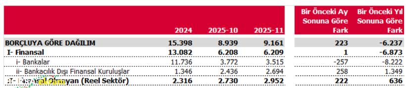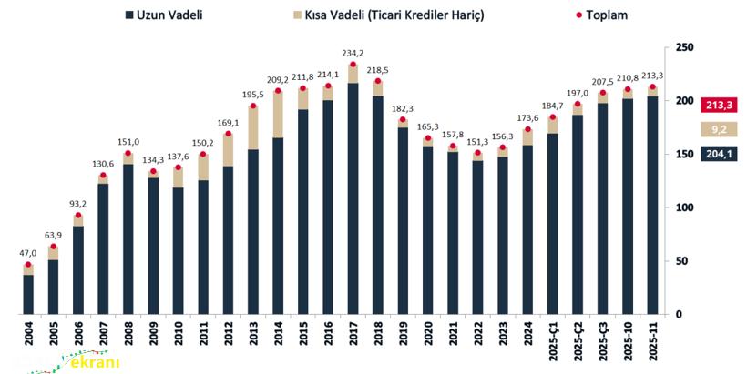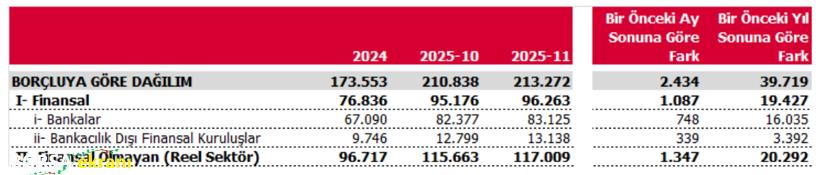 Kasım 2025 itibarıyla özel sektörün toplam yurt dışı kredi borcu, bir önceki aya göre 2,4 milyar ABD doları artarak 213,3 milyar dolar seviyesine yükseldi. Vadeye göre incelendiğinde, uzun vadeli kredi borcu 2,2 milyar ABD doları artışla 204,1 milyar ABD doları olurken, kısa vadeli kredi borcu (ticari krediler hariç) 0,2 milyar ABD doları artarak 9,2 milyar ABD doları olarak kaydedildi.