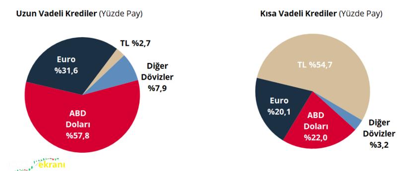 Kısa vadeli 9,2 milyar ABD doları tutarındaki kredi borcunun ise yüzde 22,0’ı ABD doları, yüzde 20,1’i Euro, yüzde 54,7’si Türk lirası ve yüzde 3,2’si diğer döviz cinslerinden oluştu.