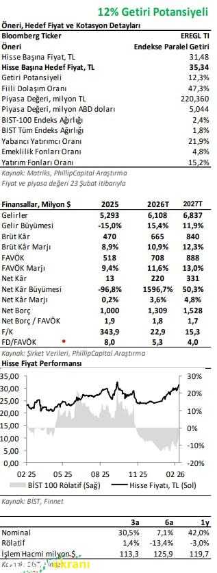 şirketin yüksek kapasite kullanım oranı ve etkin maliyet yönetimi sayesinde marjlar üzerindeki baskının sınırlı kalacağını değerlendiriyoruz. Ayrıca 2025 yılında tamamlanan ana üretim tesislerine yönelik yatırımların, 2026 yılında birim maliyetler üzerinde olumlu katkı sağlamasını bekliyoruz. Bu çerçevede, 2026 yılında yıllık %6 artışla 8,3 mn ton satış hacmi ve yıllık %35 artışla 85 USD/ton FAVÖK tahmin ediyoruz.