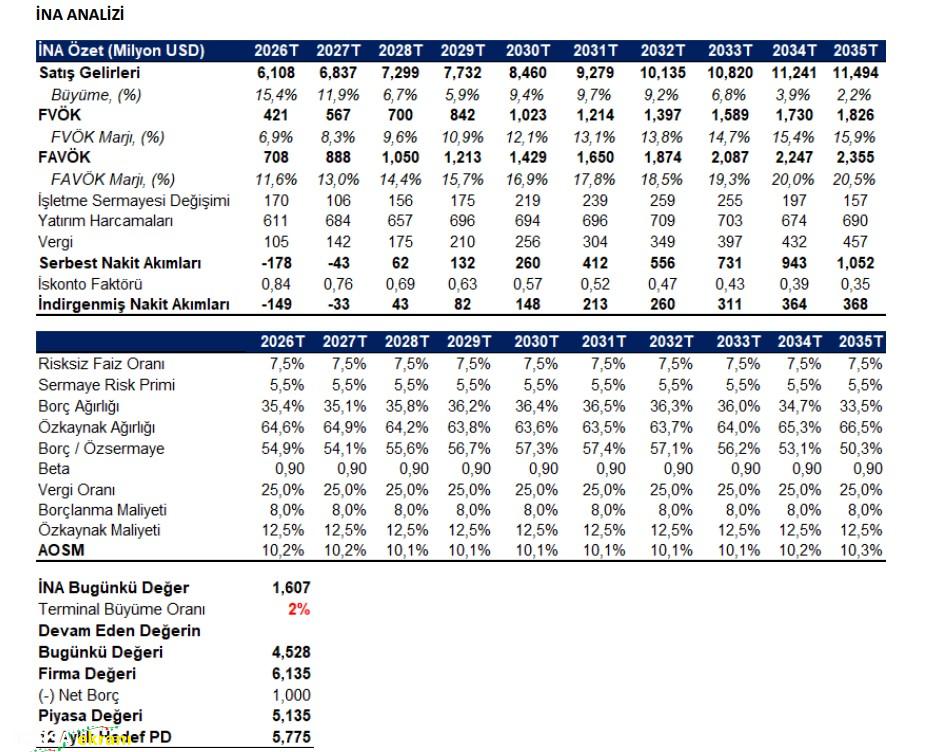 EREGL için 12 ay sonrası hedef fiyatımızı, %60 indirgenmiş nakit akışı ve %40 çarpan analizi yöntemlerini kullanarak hesaplıyoruz. 2026-2035 yıllarını kapsayan USD cinsi İNA değerlememizde; risksiz getiri oranını %7,5, piyasa risk primini %5,5, borçlanma maliyetini %8 ve şirket betasını 0,90 olarak varsaydık.