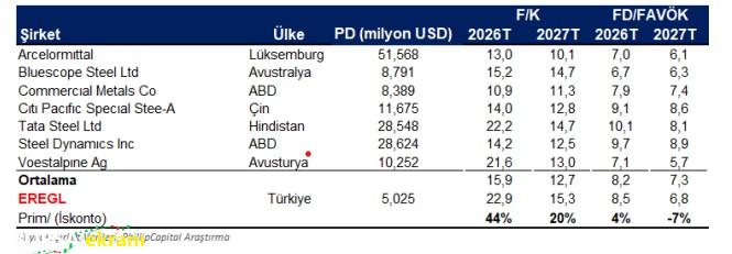 Erdemir 2026 ve 2027 yılı tahminlerimize göre F/K çarpanı bazında küresel benzer şirketlere kıyasla ortalama %32 primli işlem görmektedir. FD/FAVÖK bazında ise 8,5x olan 2026T çarpanına göre %4 primli, 6,8x olan 2027T çarpanına göre ise %7 iskontoludur.