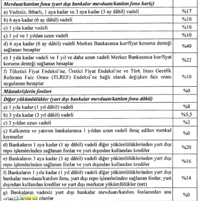 Ayrıca tebliğ kapsamında yurt dışı bankalar mevduatı/katılım fonu dahil olmak üzere 1 yıla kadar (1 yıl dahil) nbsp;vadeli diğer yükümlülüklerde zorunlu karşılık oranı yüzde 8 oldu. Bankaların 1 aya kadar (1 ay dahil) vadeli diğer yükümlülüklerinden yurt dışı repo işlemlerinden sağlanan fonlar ve yurt dışından kullanılan krediler yüzde 20 olarak belirlendi. Bankaların 3 aya kadar (3 ay dahil) vadeli diğer yükümlülüklerinden yurt dışı repo işlemlerinden sağlanan fonlar ve yurt dışından kullanılan krediler de yüzde 16 olarak açıklandı.