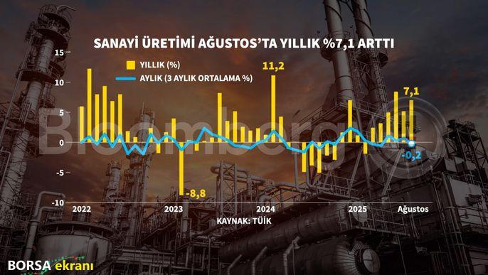 Haziran ayında, deprem sonrası en sert daralmayı yaşan sanayi üretimi endeksi yeniden artışa geçti. Sanayinin alt sektörleri (2021=100 referans yıllı) incelendiğinde, 2025 yılı Ağustos ayında madencilik ve taş ocakçılığı sektörü endeksi bir önceki yılın aynı ayına göre yüzde 2,6 arttı, imalat sanayi sektörü endeksi yüzde 7,7 arttı ve elektrik, gaz, buhar ve iklimlendirme üretimi ve dağıtımı sektörü endeksi yüzde 6,1 arttı.