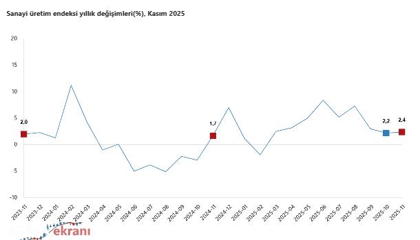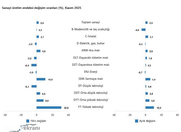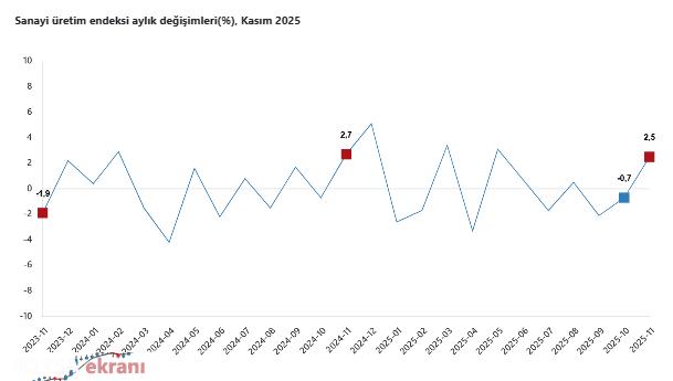 Türkiye İstatistik Kurumu, (TÜİK) 2025 yılı Kasım ayına ilişkin Sanayi Üretim Endeksi’ni açıkladı. Buna göre, sanayinin alt sektörleri (2021=100 referans yıllı) incelendiğinde, 2025 yılı Kasım ayında madencilik ve taş ocakçılığı sektörü endeksi bir önceki yılın aynı ayına göre yüzde 0,2 ve imalat sanayi sektörü endeksi yüzde 2,7 arttı. nbsp;Elektrik, gaz, buhar ve iklimlendirme üretimi ve dağıtımı sektörü endeksi ise yüzde 2 azaldı.