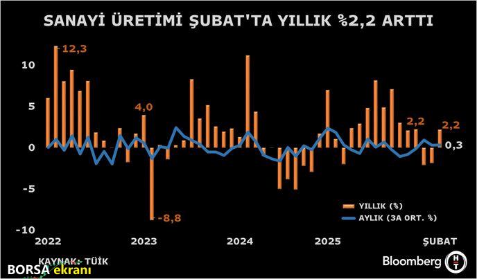 Ocak ayında gerileme görelen sanayi üretim endeksinin Şubat’ta toparladığı görüldü. Türkiye İstatistik Kurumu (TÜİK), 2026 yılı Şubat ayına ilişkin sanayi üretimi verilerini yayımladı. Buna göre, sanayi üretimi yıllık yüzde 2,2 arttı. Sanayinin alt sektörleri incelendiğinde, 2026 yılı Şubat ayında madencilik ve taş ocakçılığı sektörü endeksi bir önceki yılın aynı ayına göre yüzde 4,1 arttı, imalat sanayi sektörü endeksi yüzde 2,4 arttı ve elektrik, gaz, buhar ve iklimlendirme üretimi ve dağıtımı sektörü endeksi yüzde 2,2 azaldı.