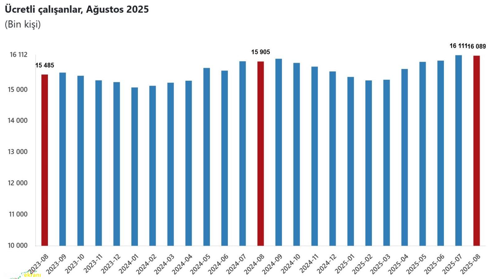 Sanayi, inşaat ve ticaret-hizmet sektörleri toplamında ücretli çalışan sayısı 2025 Ağustos ayında bir önceki yılın aynı ayına göre %1,2 arttı. Ücretli çalışan sayısı bir önceki yılın aynı ayında 15 milyon 904 bin 602 kişi iken, 2025 yılı Ağustos ayında 16 milyon 89 bin 450 kişi oldu.