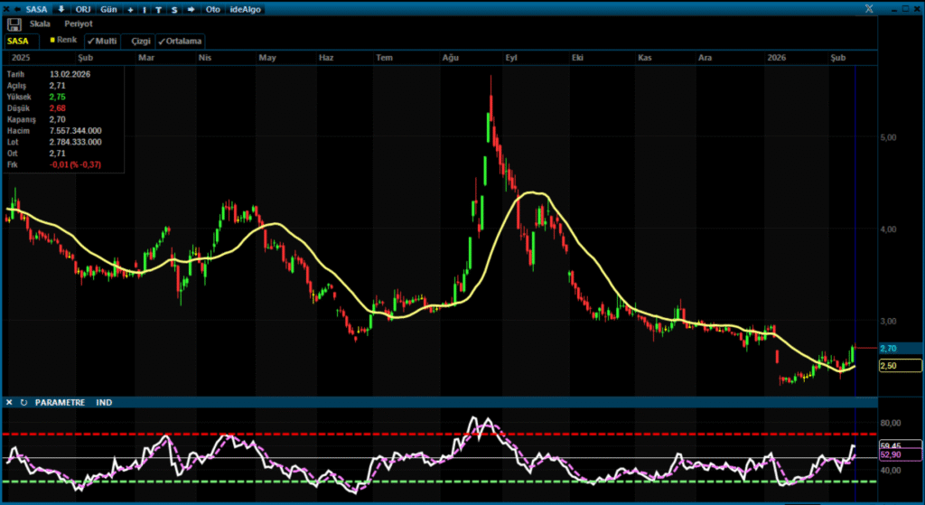 SASA hissesi 2,70 TL seviyesinde kısa vadeli toparlanma sinyalleri üretirken, ana düşüş trendi henüz kırılmış değil. 2,95–3,15 TL bandı, hissenin yönünü belirleyecek kritik direnç bölgesi olarak öne çıkıyor.