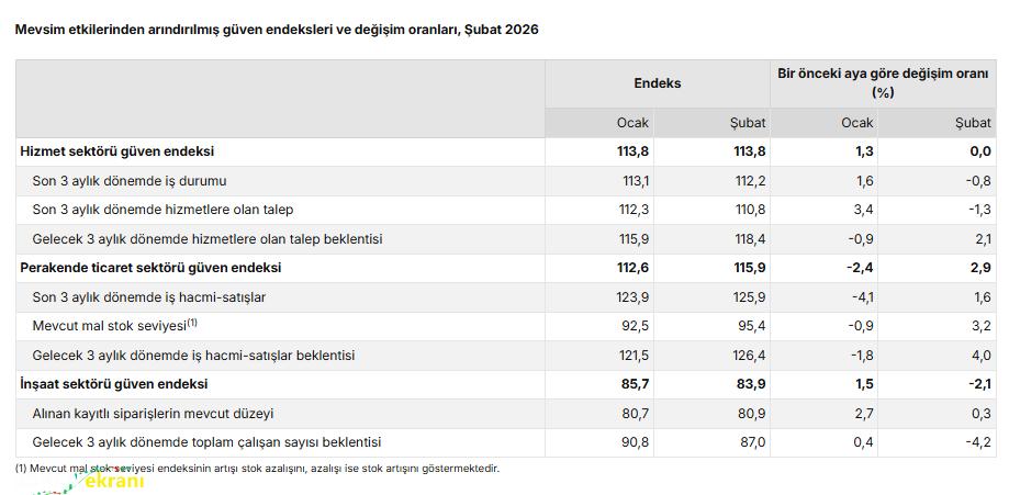 Türkiye İstatistik Kurumu (TÜİK) 2026 yılı Şubat ayına ait Hizmet, Perakende Ticaret ve İnşaat Güven Endeksleri verilerini yayımladı. Buna göre, mevsim etkilerinden arındırılmış güven endeksi Şubat ayında bir önceki aya göre hizmet sektöründe aynı düzeyde kalarak 113,8 değerini aldı. Perakende ticaret sektöründe ise güven endeksi yüzde 2,9 oranında artarak 115,9 değerini ve inşaat sektöründe yüzde 2,1 oranında azalarak 83,9 değerini aldı.