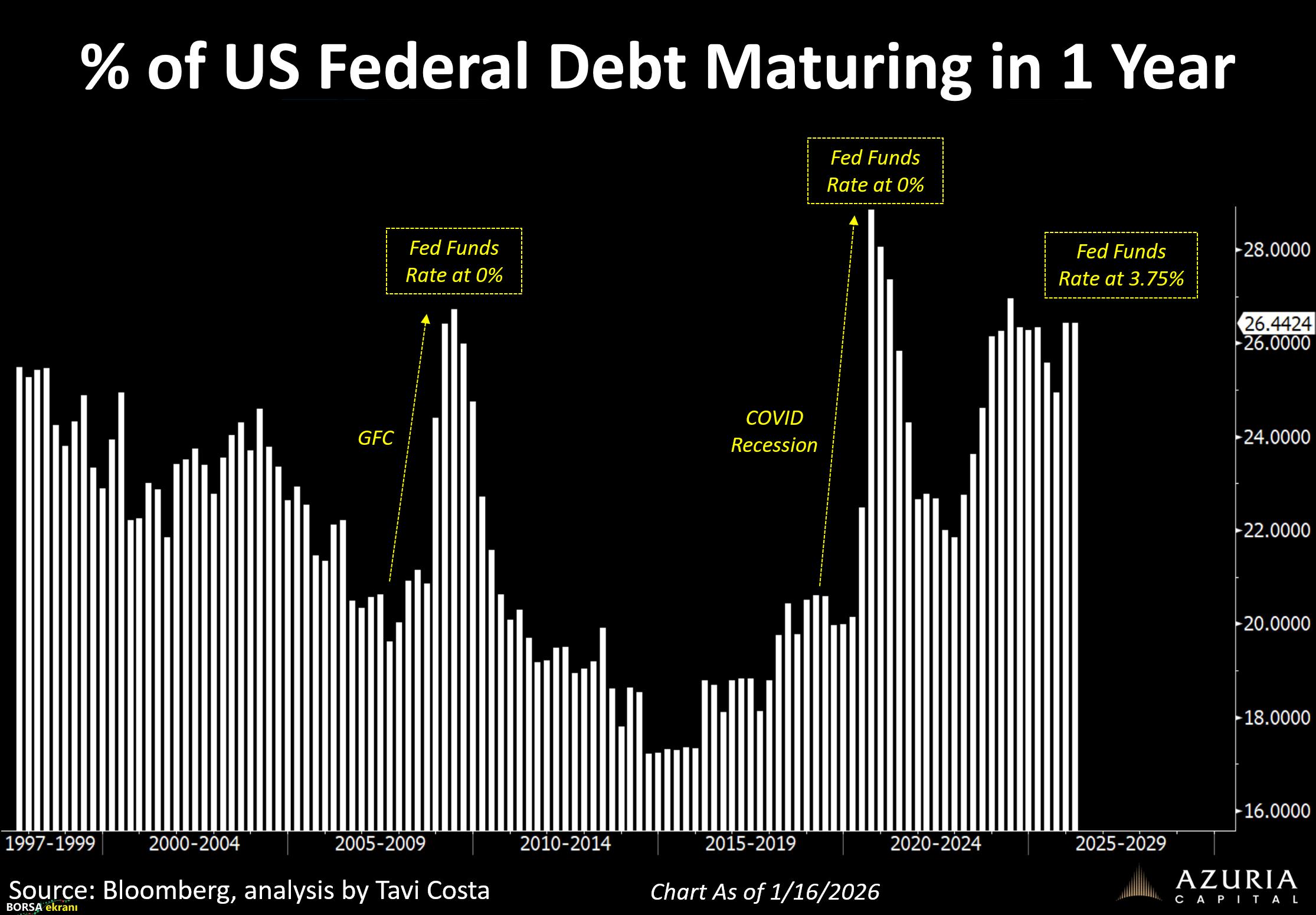 ABD ekonomisinin karşı karşıya olduğu bir diğer kritik konu, kamu borcunun vade yapısı. Toplam borcun yaklaşık dörtte biri önümüzdeki 12 ay içinde vadesini dolduracak. Bu borçlar ödenmeyecek, ancak yeniden borçlanılarak çevrilecek.
