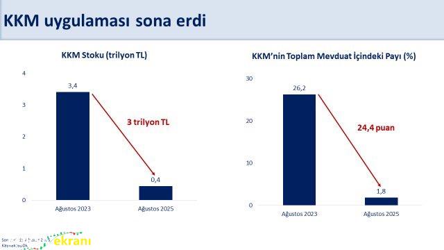 Programın önemli hedeflerinden birine daha ulaştıklarına işaret eden Şimşek, şunları kaydetti:”KKM’de artık yeni hesap açılmayacak, mevcut hesaplar da yenilenmeyecek. Zirve seviyesi 3,4 trilyon lira (143 milyar dolar) olan KKM bakiyesi, uyguladığımız program sayesinde iki yıldır kesintisiz azalarak 15 Ağustos itibarıyla 441 milyar liraya (11 milyar dolar) geriledi. Önemli bir koşullu yükümlülük olan KKM’nin sonlanmasıyla finansal istikrar daha da güçlenecek.”