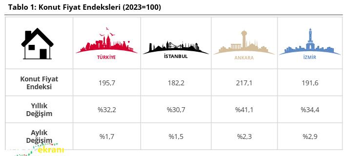 Endeks değerleri bir önceki yılın aynı ayına göre İstanbul, Ankara ve İzmir’de sırasıyla yüzde 30,7, 41,1 ve 34,4 oranlarında artış gösterdi.