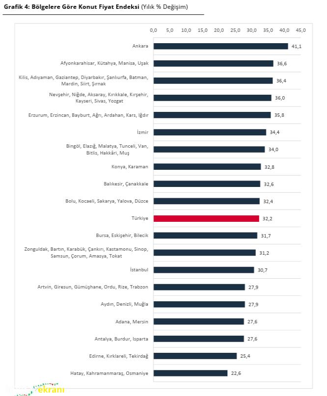 İstatistiki Bölge Birimleri Sınıflamasına göre bölgelerin yıllık konut fiyat endeksi değişimleri incelendiğinde, Eylül 2025 döneminde en yüksek yıllık artış yüzde 41,1 ile Ankara bölgesinde, en düşük yıllık artış ise yüzde 22,6 ile Hatay, Kahramanmaraş, Osmaniye bölgesinde gözlendi.
