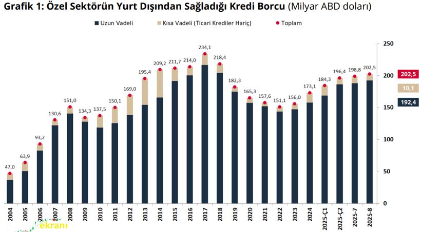 Türkiye Cumhuriyet Merkez Bankası (TCMB), Ağustos 2025 özel sektörün yurt dışından sağladığı kredi borcu istatistiklerini yayımladı. Verilere göre, özel sektörün yurt dışı kredi borcu Ağustos sonunda bir önceki aya kıyasla 3,7 milyar dolar artarak 202,5 milyar dolara çıktı. Vadeye göre bakıldığında, uzun vadeli borç 4,3 milyar dolar artışla 192,4 milyar dolar olurken, kısa vadeli borç (ticari krediler hariç) 0,6 milyar dolar azalarak 10,1 milyar dolara geriledi. Finansal kuruluşların toplam borcu Ağustos’ta 2 milyar dolar, finansal olmayan kuruluşların borcu ise 1,7 milyar dolar artış kaydetti. Uzun vadede finansal kuruluşların borçları 2,6 milyar dolar, finansal olmayan kuruluşların borçları 1,7 milyar dolar yükseldi. Kısa vadede ise her iki kesimde de düşüş görüldü.