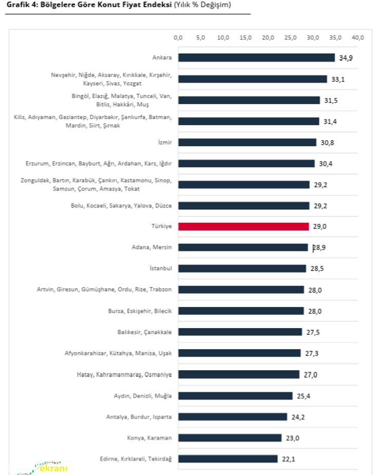 İstatistiki Bölge Birimleri Sınıflamasına göre bölgelerin yıllık konut fiyat endeksi değişimleri incelendiğinde, Aralık 2025 döneminde en yüksek yıllık artış yüzde 34,9 ile Ankara bölgesinde, en düşük yıllık artış ise yüzde 22,1 ile Edirne, Kırklareli, Tekirdağ bölgesinde gözlendi.