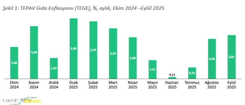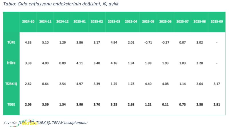 TEPAV Gıda Fiyat Endeksi (TEGE) kapsamında 1-30 Eylül 2025 döneminde derlenen verilerle aylık gıda enflasyon oranı yüzde 2,81 olarak hesaplandı. 1-30 Eylül 2025 dönemi için 1 Ekim 2025 tarihi itibarıyla diğer kuruluşlar tarafından hesaplanan gıda enflasyonu TÜRK-İŞ mutfak enflasyonu ile yüzde 3,17 oldu.