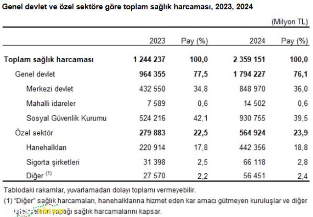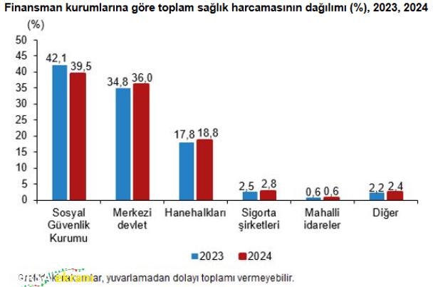 Açıklamaya göre toplam sağlık harcamasının yüzde 76,1’i genel devlet tarafından finanse edildi. Özel sektörün payı yüzde 23,9 olarak hesaplandı. Alt kırılımlarda ise Sosyal Güvenlik Kurumu yüzde 39,5, merkezi devlet yüzde 36, hanehalkları yüzde 18,8, sigorta şirketleri yüzde 2,8, hanehalklarına hizmet eden kar amacı gütmeyen kuruluşlar ve diğer işletmeler yüzde 2,4, mahalli idareler ise yüzde 0,6 pay aldı.