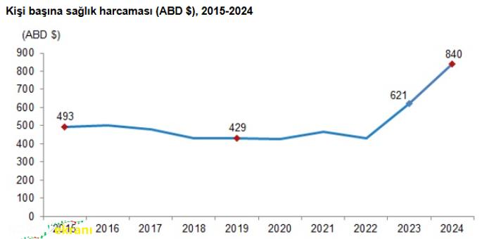 Kişi başına sağlık harcaması, bir yılda yüzde 89,2 artarak 27 bin 587 TLye yükseldi. Bu tutar dolar bazında 2023’te 621 dolar iken 2024’te yüzde 35,3 artışla 840 dolara çıktı.