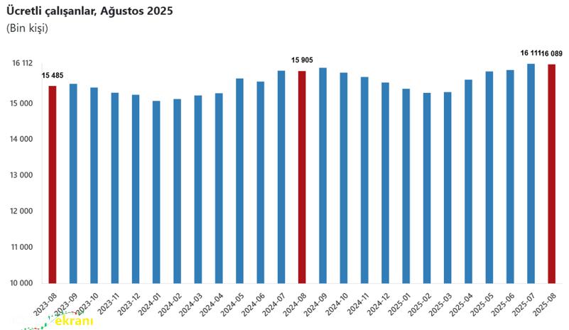 Türkiye İstatistik Kurumu (TÜİK) ‘Ücretli Çalışan İstatistikleri, Ağustos 2025’ verilerini açıkladı. Buna göre; sanayi, inşaat ve ticaret-hizmet sektörleri toplamında ücretli çalışan sayısı 2025 Ağustos ayında bir önceki yılın aynı ayına göre yüzde 1,2 arttı. Ücretli çalışan sayısı bir önceki yılın aynı ayında 15 milyon 904 bin 602 kişi iken, 2025 yılı Ağustos ayında 16 milyon 89 bin 450 kişi oldu. Ücretli çalışanların alt detaylarına bakıldığında; 2025 Ağustos ayında ücretli çalışan sayısı yıllık olarak sanayi sektöründe yüzde 3,6 azaldı, inşaat sektöründe yüzde 7,2 arttı ve ticaret-hizmet sektöründe yüzde 2,6 arttı.