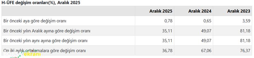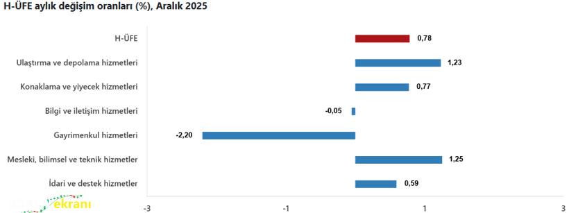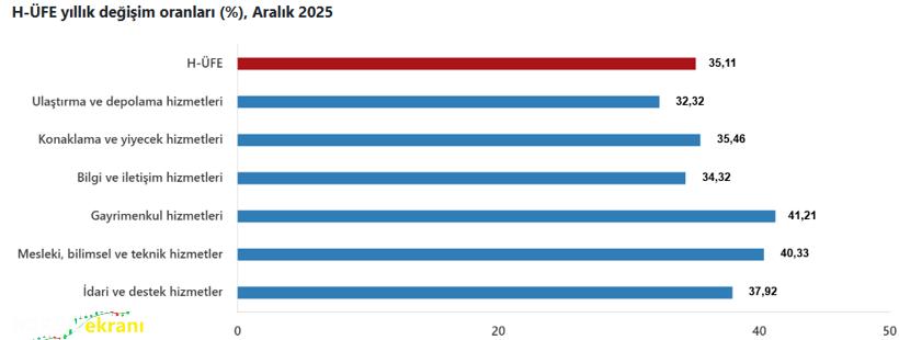 Türkiye İstatistik Kurumu (TÜİK), aralık ayına ilişkin Hizmet Üretici Fiyat Endeksi (H-ÜFE) verilerini yayımladı. Buna göre H-ÜFE, aralık ayında bir önceki aya göre yüzde 0,78 artış gösterirken, bir önceki yılın aralık ayına ve aynı ayına göre yüzde 35,11 yükseldi. On iki aylık ortalamalara göre artış ise yüzde 36,78 olarak kaydedildi.